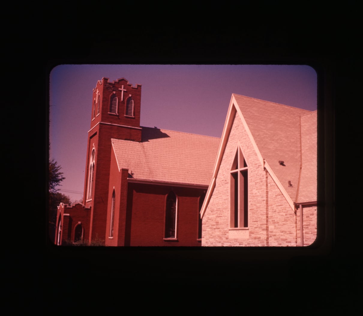 a new church (pictured). The original church building was moved to a lot directly east of the church (seen in the far left of the photo) and was used as a school.